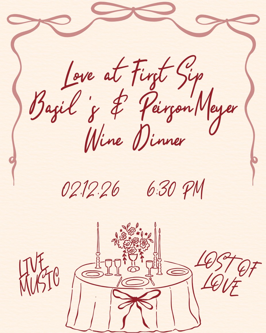 Join us for an evening where romance meets the perfect pour. Love at First Sip is a special Valentineâs-themed wine dinner featuring the exceptional wines of PiersonMeyer paired beautifully with Mediterranean-inspired cuisine from Basilâs Restaurant.