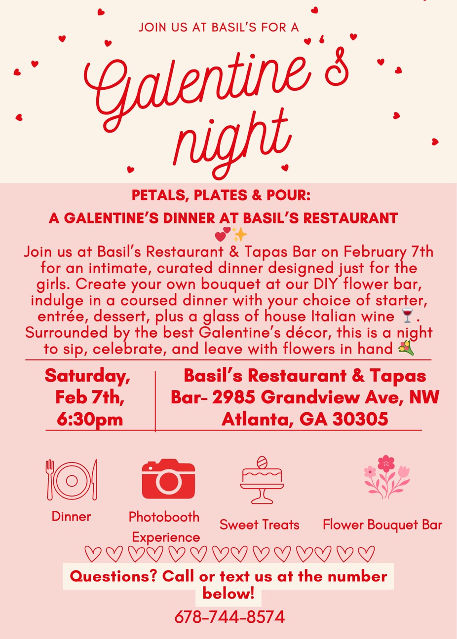 Grab your girls and join us at Basilâs Restaurant & Tapas Bar for an unforgettable Galentineâs celebration designed just for the ladies. This intimate evening features a thoughtfully curated, coursed dinner with your choice of starter, entrĂ©e, and dessert, plus a complimentary glass of house Italian wine to toast the night.