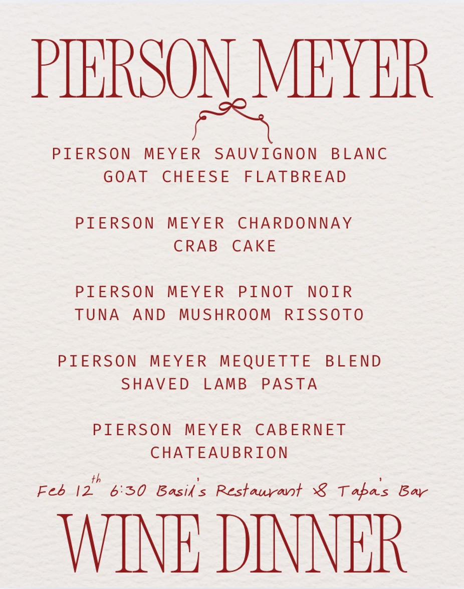 Join us for an evening where romance meets the perfect pour. Love at First Sip is a special Valentineâs-themed wine dinner featuring the exceptional wines of PiersonMeyer paired beautifully with Mediterranean-inspired cuisine from Basilâs Restaurant.