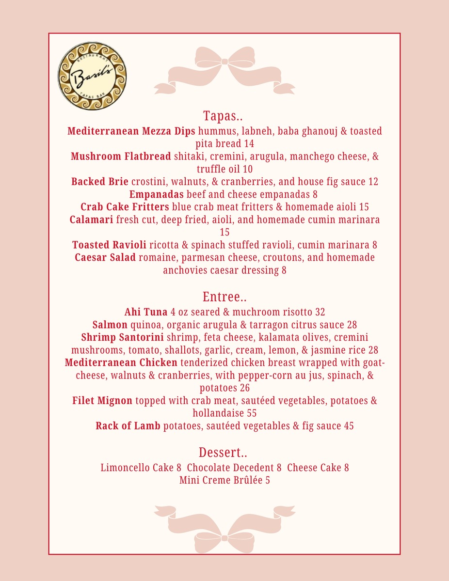 Grab your girls and join us at Basilâs Restaurant & Tapas Bar for an unforgettable Galentineâs celebration designed just for the ladies. This intimate evening features a thoughtfully curated, coursed dinner with your choice of starter, entrĂ©e, and dessert, plus a complimentary glass of house Italian wine to toast the night.